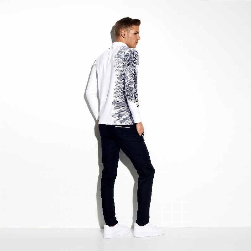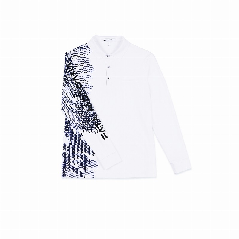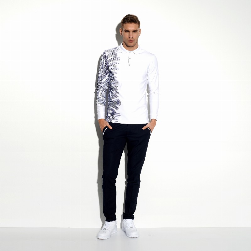 Printed Polo Shirt White Blue 210 € Size Select an option... 50 52 54 56 58 Qty 1 Add to cart Description This polo shirt made from soft viscose jersey has a sporty casual style. The Fata Morgana ""grid"" oversize screen print features asymmetrically on the right side, embellished with an embroidered logo all along the printed sleeve. Additional information Product type T-shirts Color White Material Elastane, Viscose Washing and caring Hand wash. Do not bleach or tumble dry. Cool iron, specialist dryclean option. Cover or remove all buttons and garment accessories before cleaning exclusive of trims. Size and fit SKU 1091M83313 Share