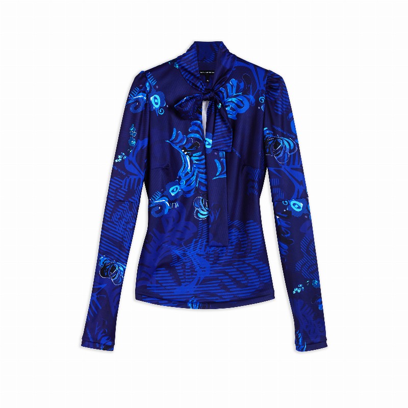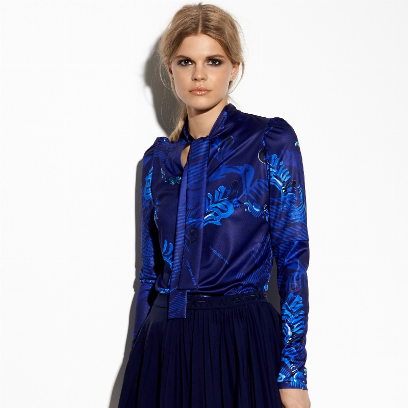 Printed Jersey Blouse 480 € Size Select an option... 36 38 40 Qty 1 2 Add to cart Description An elegant symmetrical long sleeve blouse with self bow closure at the front. Featuring the Fata Morgana ""bone-leaf"" pattern in royal blue shade in an open front design. The branded print add a signature finish to the eyecatching, cool jet classical silhouette. Additional information Product type Blouses Color Navy Blue Material Polyester Washing and caring Machine wash at 30 °C. Do not bleach, do not tumble dry. Ironing: cool iron. Cover or remove all buttons and garment accessories before cleaning. Size and fit Fits true to size indicated by the designer on the label. SKU 1091W89143 Share