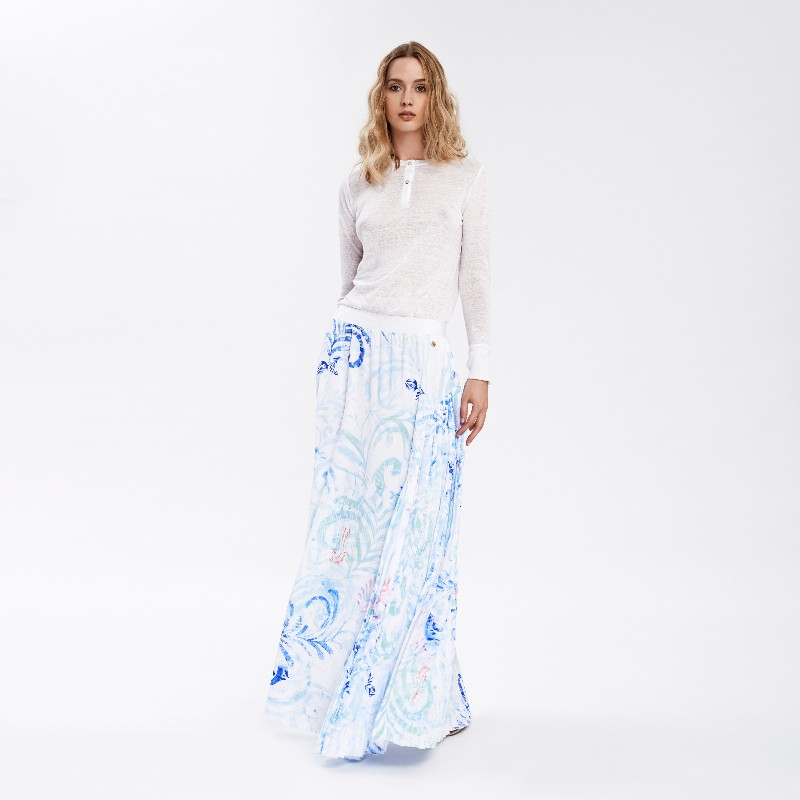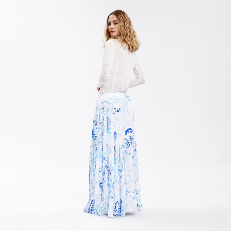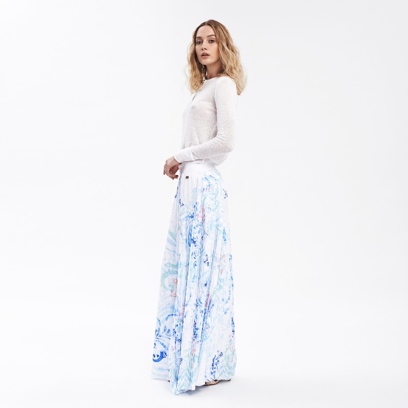 Pleated Detail Printed Maxi Skirt 480 € Size Select an option... 36 38 40 Qty 1 2 3 4 Add to cart Description This printed asymmetric maxi skirt cut from airy polyester silk, and sways beautifully with every step. Features the Fata Morgana "glow-pattern" composition inspired by the hungarian folk art's heritage and the colours of lightpainting, variation of sea-blue colourway. Additional information Product type Skirts Color Blue Printed Material Polyester Washing and caring Dryclean ONLY. Do not wash, bleach or tumble dry. Ironing: low temperature. Cover or remove all buttons and garment accessories before cleaning. Size and fit Slightly flexible to size indicated by the designer on the label. SKU 2061W9313 Share